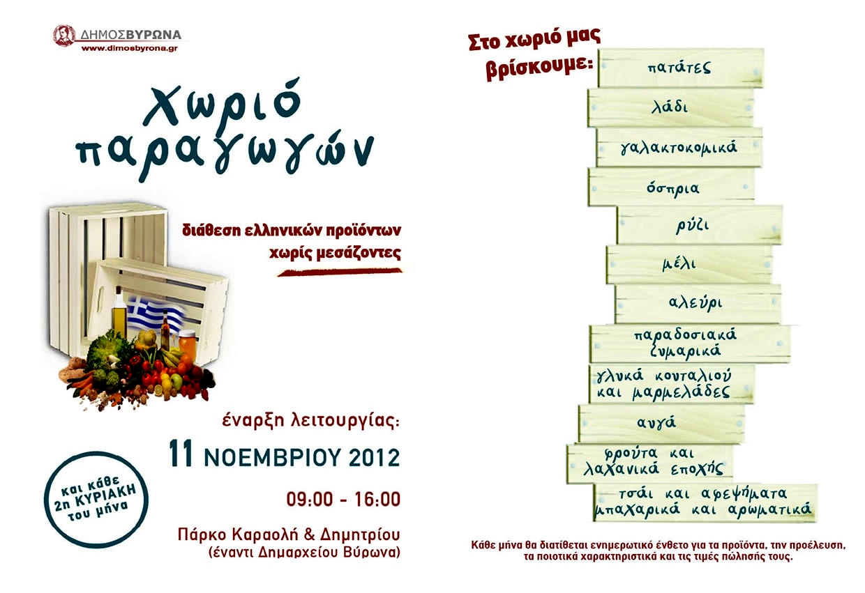 Την Κυριακή 11 Νοεμβρίου ανοίγει για πρώτη φορά τις πόρτες του το «Χωριό Παραγωγών» του Δήμου Βύρωνα, στο οποίο παραγωγοί από όλη τη χώρα θα διαθέτουν τα προϊόντα τους, χωρίς μεσάζοντες, κατευθείαν στον καταναλωτή, σε ανταγωνιστικές τιμές.